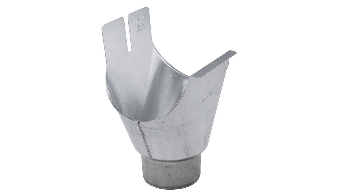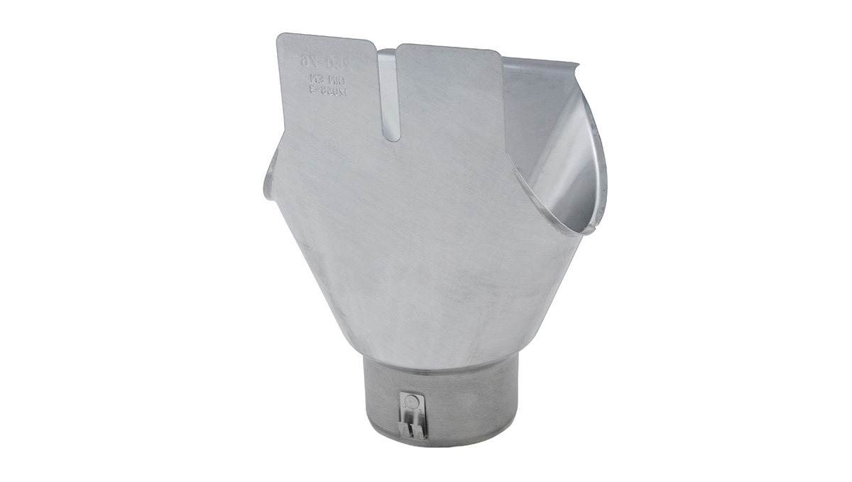 Der Ablaufstutzen verbindet die Dachrinne (Durchmesser 76 mm, 8-teilig) mit dem Rohrbogen bzw. dem Fallrohr (Durchmesser 76 mm). Mit Klemmhalter zur vereinfachten Rohrbogenmontage, maschinell geschweißt, Form G gerade.