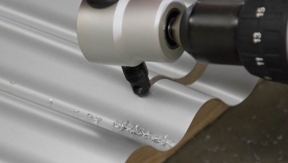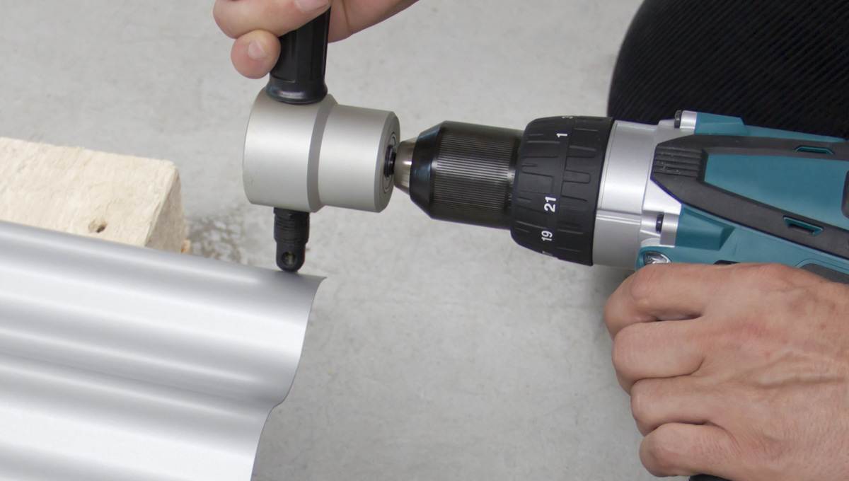 Der Blechknabber-Aufsatz für Bohrmaschinen oder Akku-Schrauber hat zwei Schneidköpfe und eignet sich zum Schneiden von flachen Trapezblechen oder gewellten Wellblechen. Mühelos sind auch enge Radien und präzise Ausschnitte zu bewältigen.