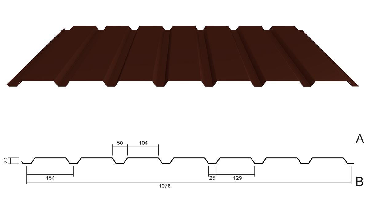 Das Stahltrapezprofil M 20/154 in der Blechdicke 0,63 mm als Wandprofil mit 25 µm Polyester Beschichtung. Das Profil eignet sich als Wandprofil bei geringen Abständen der Unterkonstruktion oder vollflächiger Auflage.