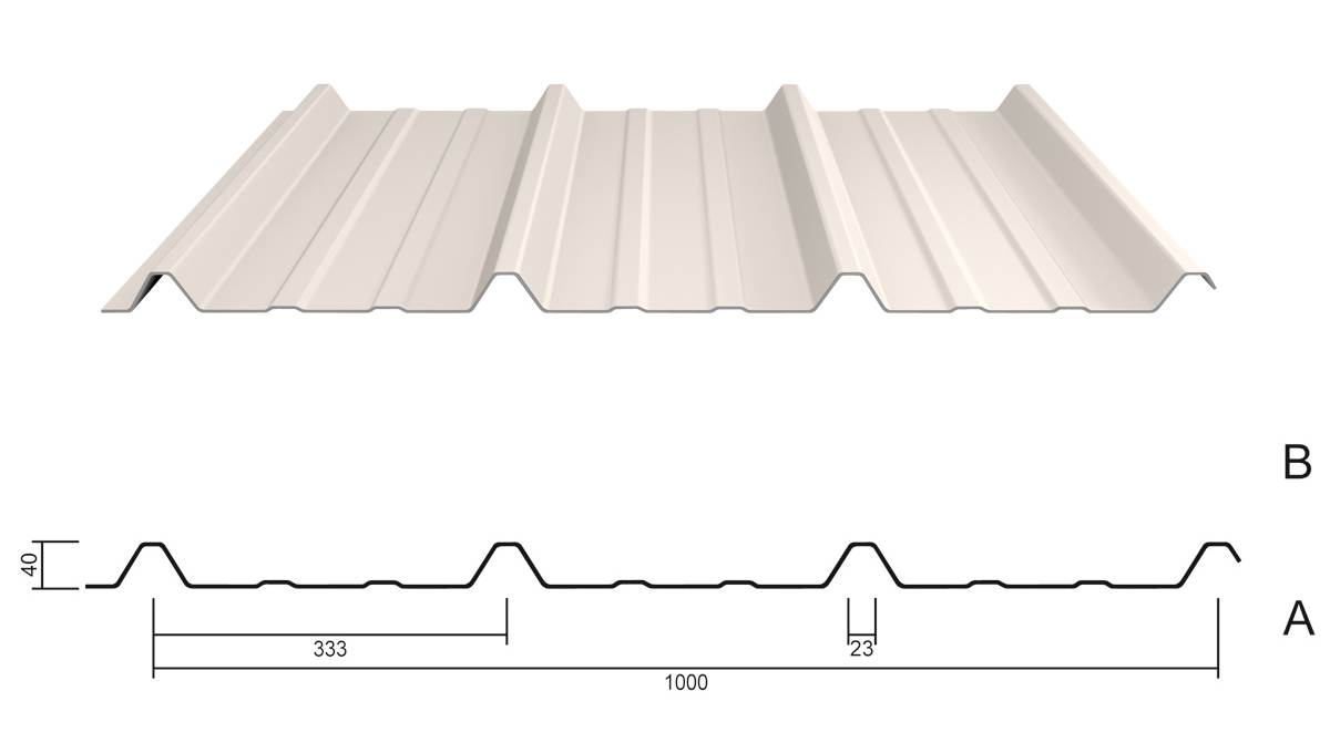 Das Stahltrapezprofil M 40KD/333 fertigen wir in vielen Standardfarben, es kann als Dach- oder Wandprofil eingesetzt werden. Die maximale Fertigungslänge beträgt 24.300 mm. Viele verschiedene Varianten in Farbe und Beschichtung sind möglich.