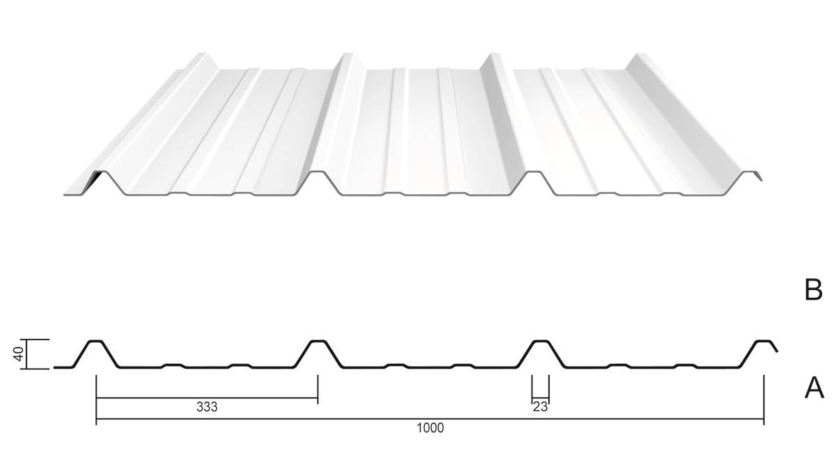 Das Stahltrapezprofil M 40KD/333 fertigen wir in vielen Standardfarben, es kann als Dach- oder Wandprofil eingesetzt werden. Die maximale Fertigungslänge beträgt 24.300 mm. Viele verschiedene Varianten in Farbe und Beschichtung sind möglich.