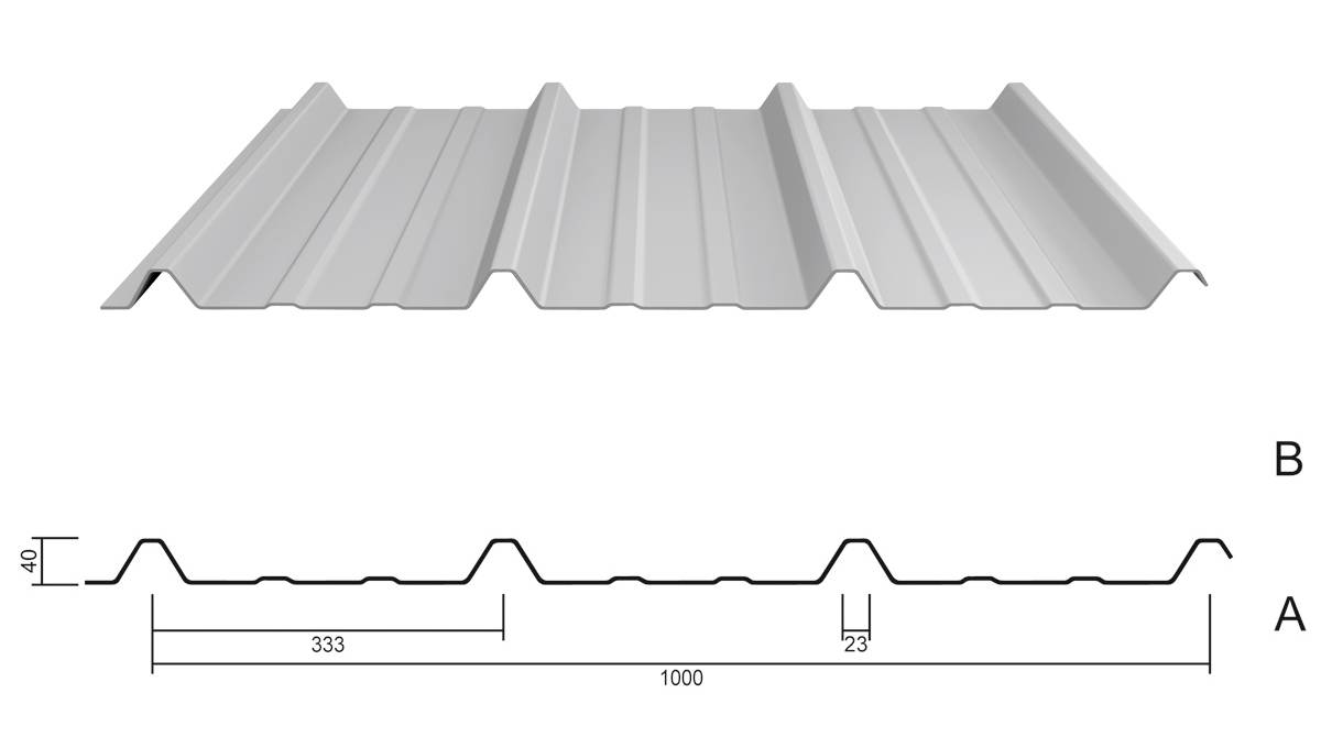 Das Stahltrapezprofil M 40KD/333 fertigen wir in vielen Standardfarben, es kann als Dach- oder Wandprofil eingesetzt werden. Die maximale Fertigungslänge beträgt 24.300 mm. Viele verschiedene Varianten in Farbe und Beschichtung sind möglich.