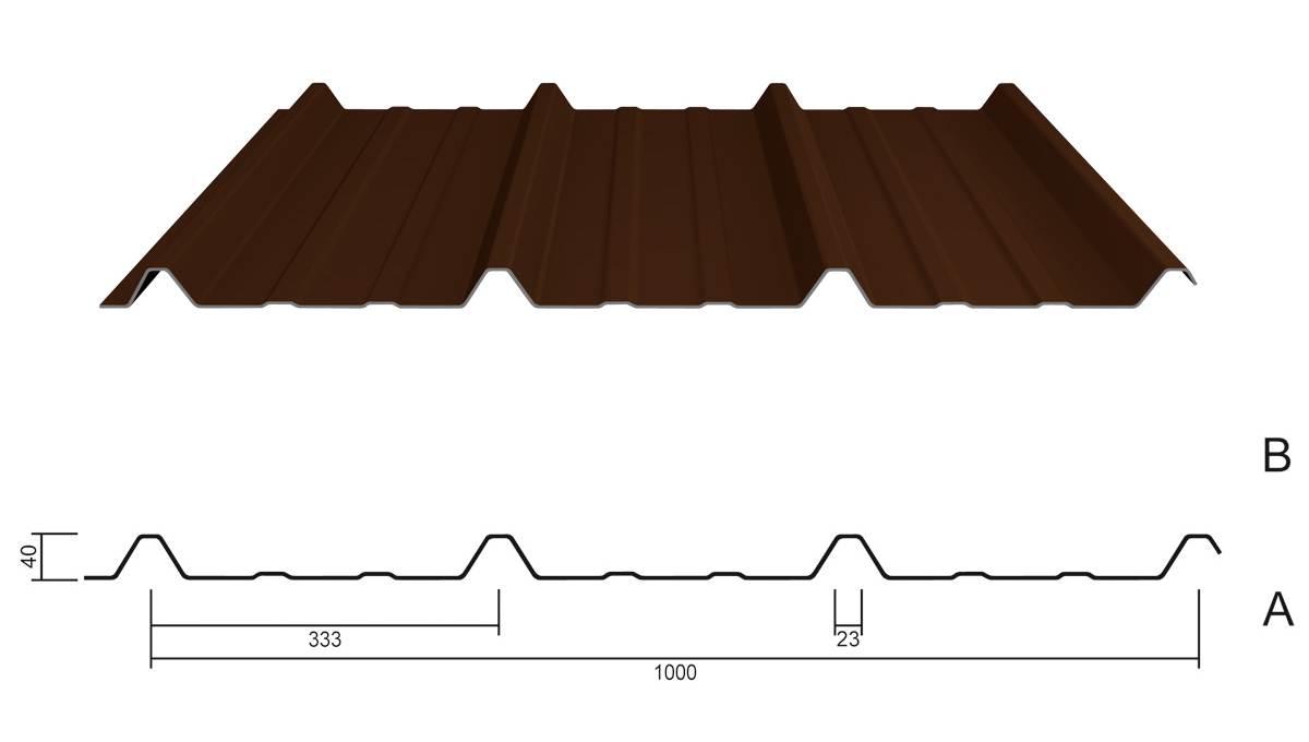 Das Stahltrapezprofil M 40KD/333 fertigen wir in vielen Standardfarben, es kann als Dach- oder Wandprofil eingesetzt werden. Die maximale Fertigungslänge beträgt 24.300 mm. Viele verschiedene Varianten in Farbe und Beschichtung sind möglich.