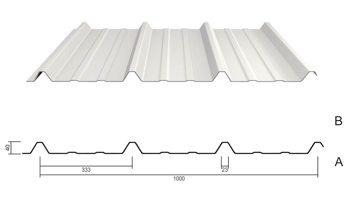 Das klassische Dachblech M 40KD/333, ein bewertes Trapezprofil mit Stützfuß, hier in der Blechdicke 0,75 mm eignet sich als Kaltdachprofil bei geringen bis mittleren Abständen der Unterkonstruktion oder vollflächiger Auflage. Angaben zur Profilhöhe, Sickenbreite und zu der Deckbreite finden Sie in der detaillierten Produktzeichnung zum Trapezblech M 40KD/333.