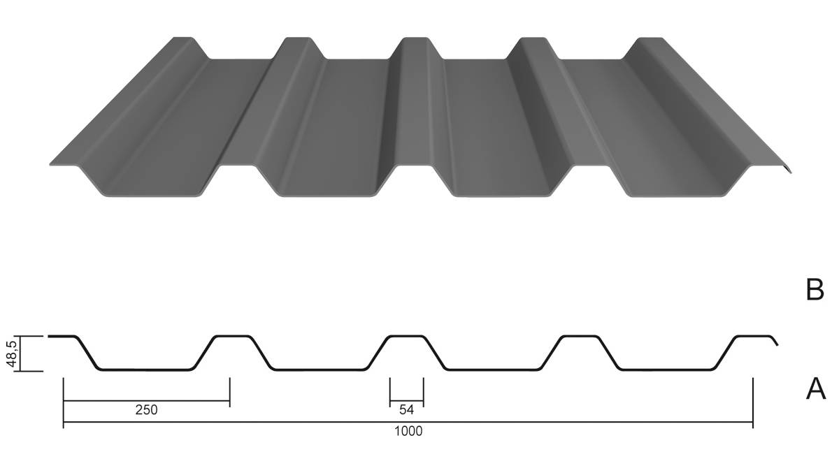 Das Stahltrapezprofil M 50/250 fertigen wir in vielen Standardfarben, es kann als Dach- oder Wandprofil eingesetzt werden. Die maximale Fertigungslänge beträgt 24.300 mm. Viele verschiedene Varianten in Farbe und Beschichtung sind möglich.