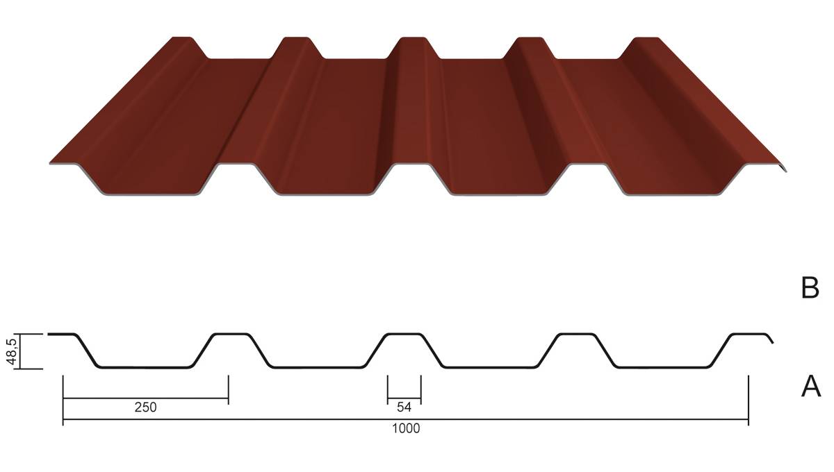 Das Stahltrapezprofil M 50/250 fertigen wir in vielen Standardfarben, es kann als Dach- oder Wandprofil eingesetzt werden. Die maximale Fertigungslänge beträgt 24.300 mm. Viele verschiedene Varianten in Farbe und Beschichtung sind möglich.