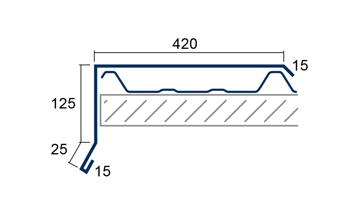 Als Ortgang (15/25/125/420/15) wird der seitliche Dachverlauf von der Traufe bis zum First bezeichnet. Spezielle Kantteile, sogenannte Ortgangbleche, schließen das Dachblech über die Kanten ab und tragen so zu einem zusätzlichen Schutz vor Verwitterung der Dachunterkonstruktion bei. So erhält man einen sauberen funktionellen und optischen Dachblech-Abschluss.