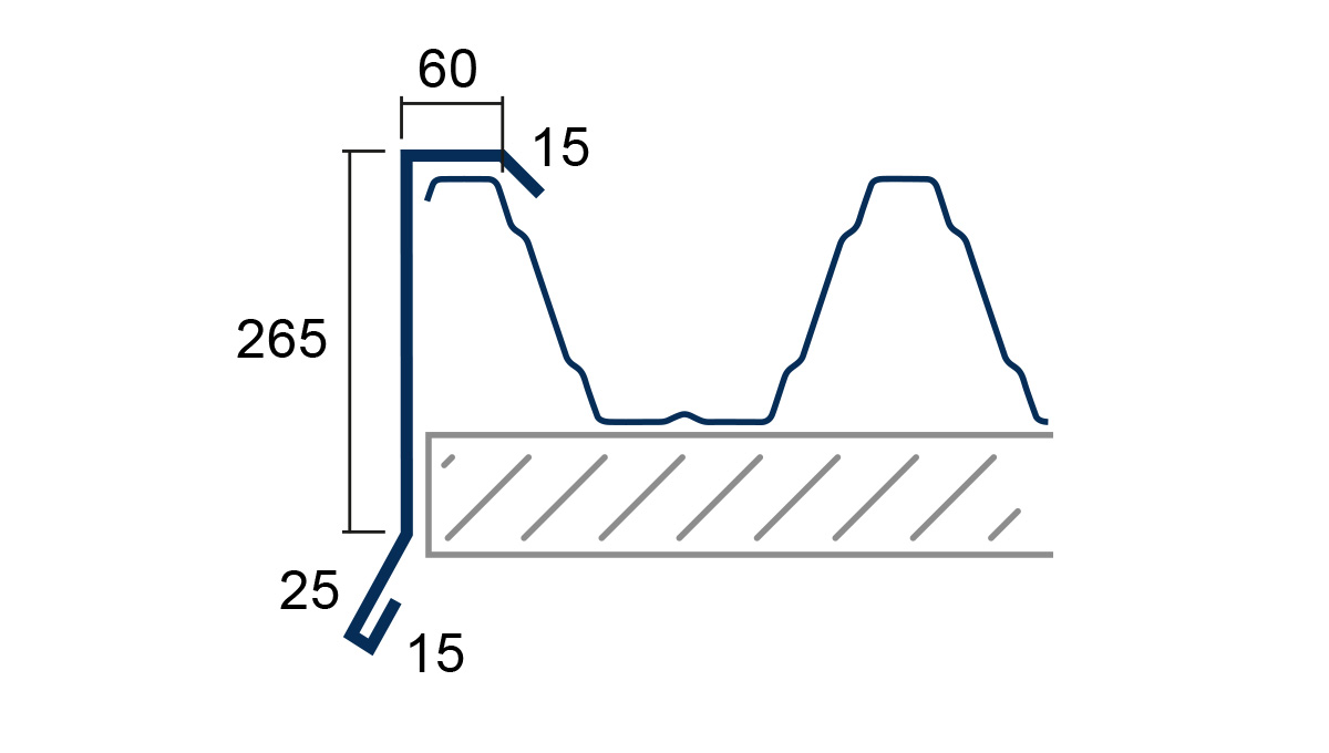 Als Ortgang (15/25/265/60/15) wird der seitliche Dachverlauf von der Traufe bis zum First bezeichnet. Spezielle Kantteile, sogenannte Ortgangbleche, schließen das Dachblech über die Kanten ab und tragen so zu einem zusätzlichen Schutz vor Verwitterung der Dachunterkonstruktion bei. So erhält man einen sauberen funktionellen und optischen Dachblech-Abschluss.