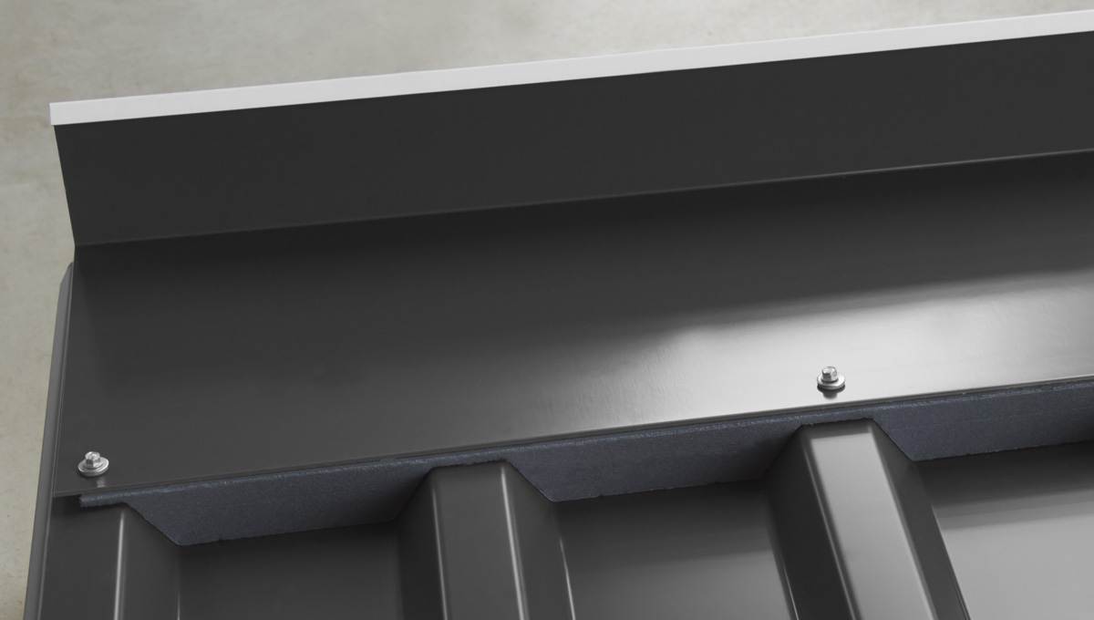 Profilfüller legen Sie im Firstbereich einfach zwischen das Profil und Kantteil und füllen somit die großen Sicken von oben. Beim Verschrauben der Kantteile werden die Füllerleisten geklemmt und sind somit dauerhaft fest. Zusätzlich empfehlen wir noch ein Zahnblech.