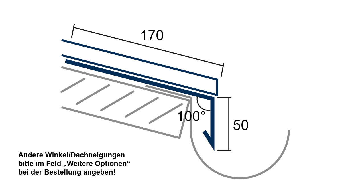Wir kanten die geneigten Wandanschlußprofile mit einem Innenwinkel von 100 Grad vor. Wünschen Sie Ihren individuellen Wandanschluss mit einem anderen Innenwinkel, vermerken Sie es bitte bei der Bestellung.