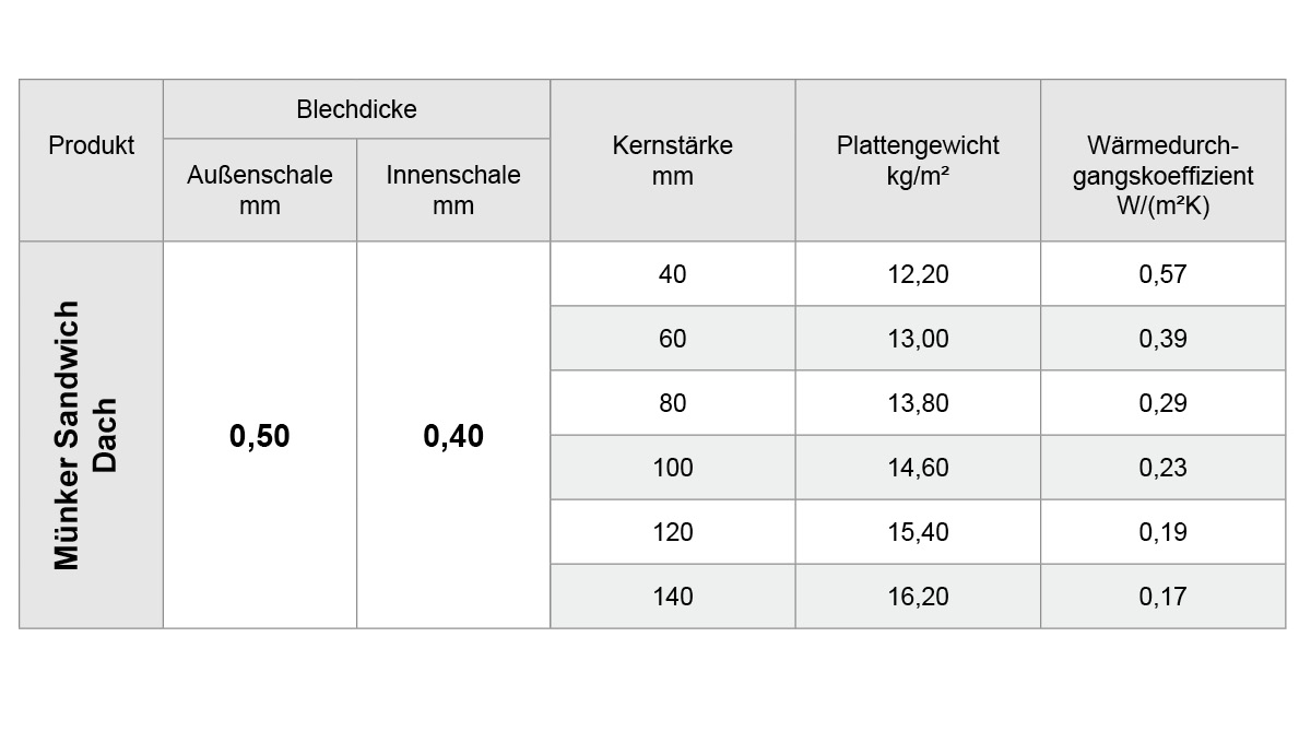 | Dach | U= 0,2 W/(m²K) = Münker Sandwich Dach/Wand 120 mm Kern |