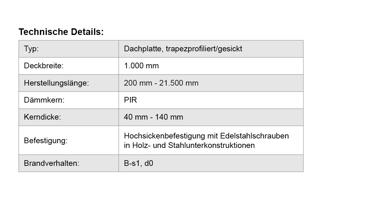 Je nach Materialstärke und Dämmkern, sowie der Standortabhängigen Schneelast können Spannweiten bis zu 6 m erreicht werden. Die Mindestdachneigung für den Einsatz von Sandwich Dachplatten beträgt 5° ohne Ausbildung von Querstößen.