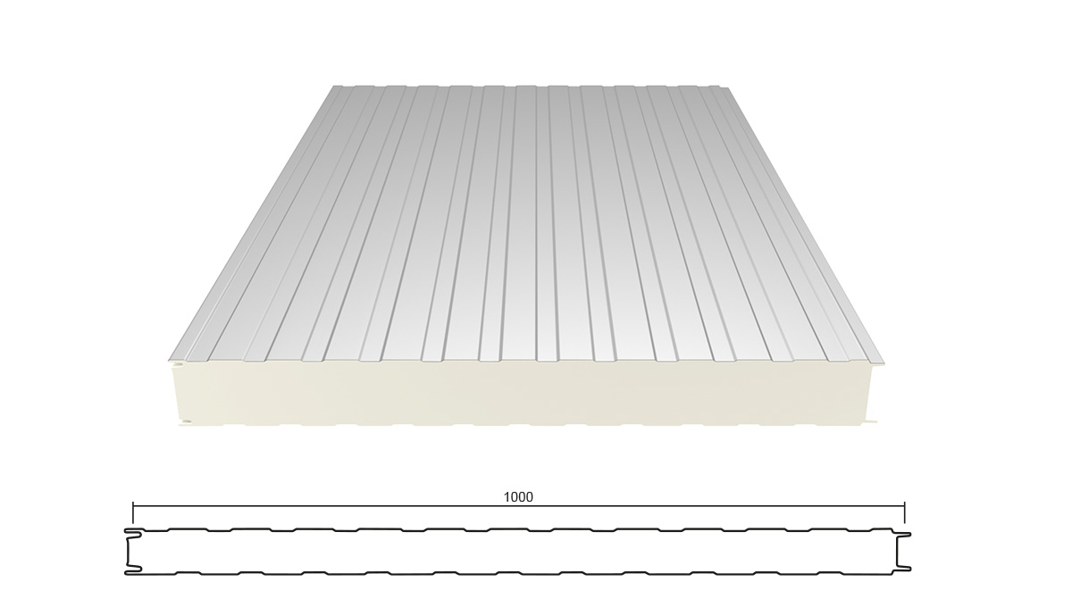 Eine Sandwich Wandplatte besteht aus einem Verbund zweier metallischer Deckschalen und einem Stützkern aus hochwärmedämmenden PIR-Schaum. Durch die Kombination der verschiedenen Materialien kann die Errichtung einer gedämmten Wand besonders schnell, einfach und flexibel ausgeführt werden. Gute Wärmedämmung machen diese Bauelemente auch für Bauherren außerhalb des Industriebau-Bereiches interessant. Kerndicke dieser Platte beträgt 80 mm.