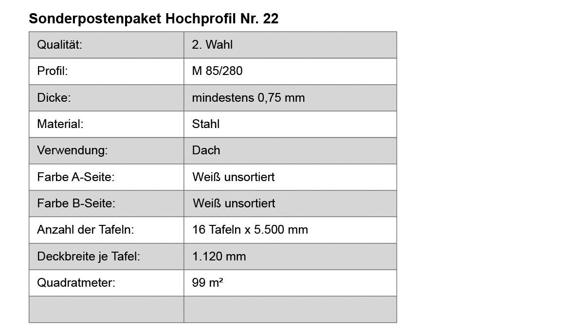Dieses Sonderpostenpaket ist nur einmal erhältlich. Eine Gewähr auf Verfügbarkeit besteht nicht. Die Anzahl der Tafeln und deren Länge können nicht geändert werden.