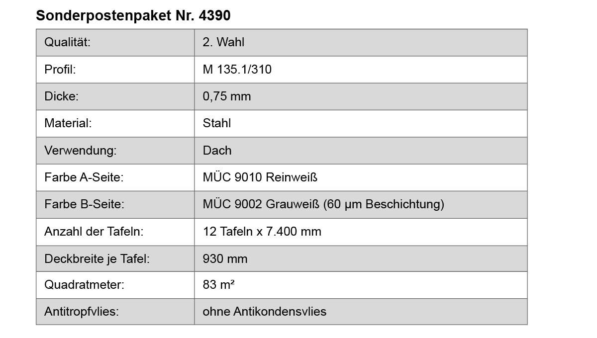 Es handelt es sich um Ware aus Überproduktion/Restabschnitten. Die Tafeln können Mängel, wie z.B. Beulen, Farbabweichungen, Kratzer, teilweise unbeschichtetes Material oder teilweise Vliesbeschichtung von unten, aufweisen. Diese Mängel stellen keinen Reklamationsgrund dar. Sofern unter „technischen Daten“ keine konkrete Materialstärke angegeben ist, kann die Materialstärke variieren. Der Profiltyp innerhalb eines Pakets ist gleich, die Geometrie kann variieren.