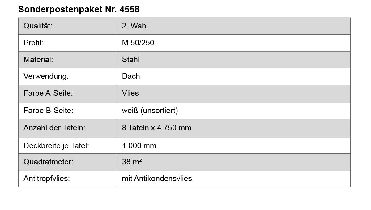 Es handelt es sich um Ware aus Überproduktion/Restabschnitten. Die Tafeln können Mängel, wie z.B. Beulen, Farbabweichungen, Kratzer, teilweise unbeschichtetes Material oder teilweise Vliesbeschichtung von unten, aufweisen. Diese Mängel stellen keinen Reklamationsgrund dar. Sofern unter „technischen Daten“ keine konkrete Materialstärke angegeben ist, kann die Materialstärke variieren. Der Profiltyp innerhalb eines Pakets ist gleich, die Geometrie kann variieren.