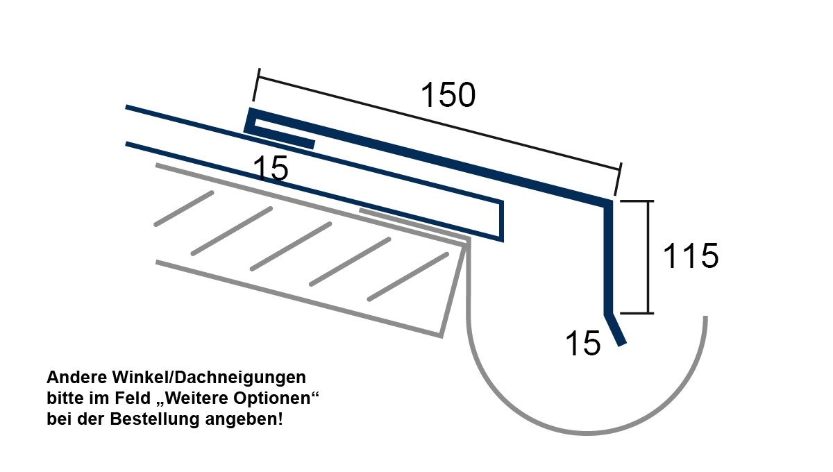Wir kanten die geneigten Wandanschlußprofile mit einem Innenwinkel von 100 Grad vor. Wünschen Sie Ihren individuellen Wandanschluss mit einem anderen Innenwinkel, vermerken Sie es bitte bei der Bestellung.