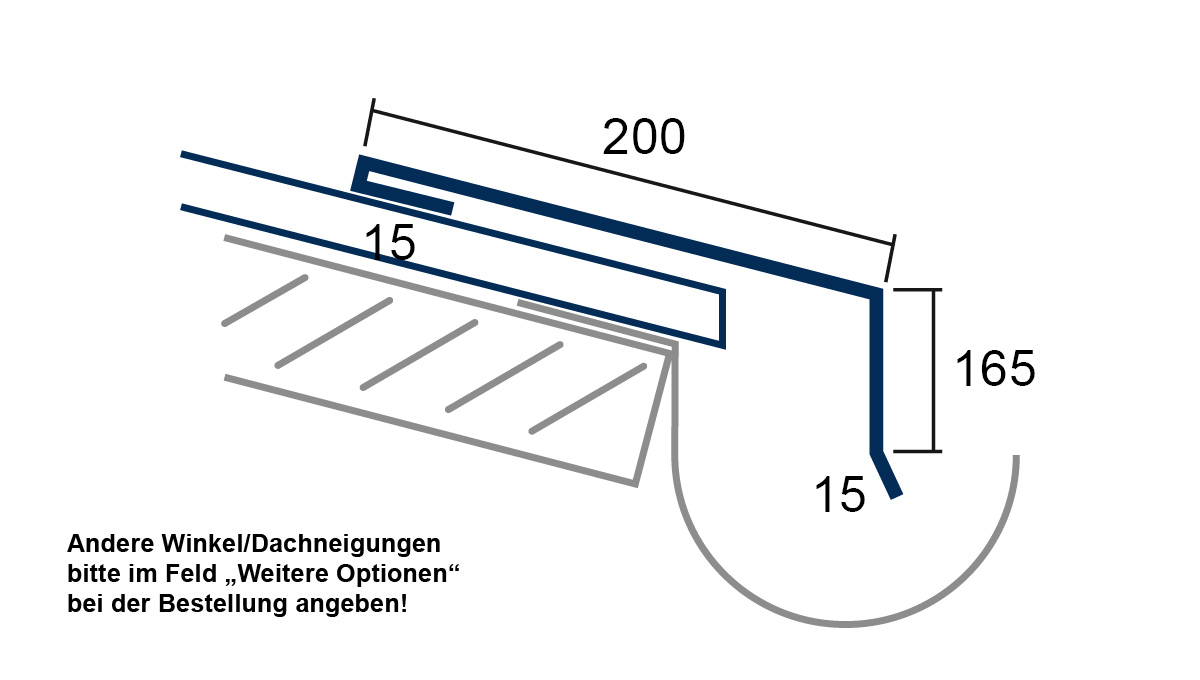 Wir kanten die geneigten Wandanschlußprofile mit einem Innenwinkel von 100 Grad vor. Wünschen Sie Ihren individuellen Wandanschluss mit einem anderen Innenwinkel, vermerken Sie es bitte bei der Bestellung.
