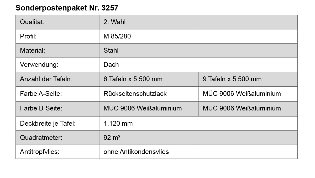 Es handelt es sich um Ware aus Überproduktion/Restabschnitten. Die Tafeln können Mängel, wie z.B. Beulen, Farbabweichungen, Kratzer, teilweise unbeschichtetes Material oder teilweise Vliesbeschichtung von unten, aufweisen. Diese Mängel stellen keinen Reklamationsgrund dar. Sofern unter „technischen Daten“ keine konkrete Materialstärke angegeben ist, kann die Materialstärke variieren. Der Profiltyp innerhalb eines Pakets ist gleich, die Geometrie kann variieren.