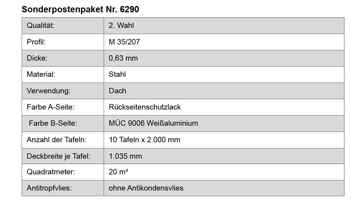 Es handelt es sich um Ware aus Überproduktion/Restabschnitten. Die Tafeln können Mängel, wie z.B. Beulen, Farbabweichungen, Kratzer, teilweise unbeschichtetes Material oder teilweise Vliesbeschichtung von unten, aufweisen. Diese Mängel stellen keinen Reklamationsgrund dar. Sofern unter „technischen Daten“ keine konkrete Materialstärke angegeben ist, kann die Materialstärke variieren. Der Profiltyp innerhalb eines Pakets ist gleich, die Geometrie kann variieren.