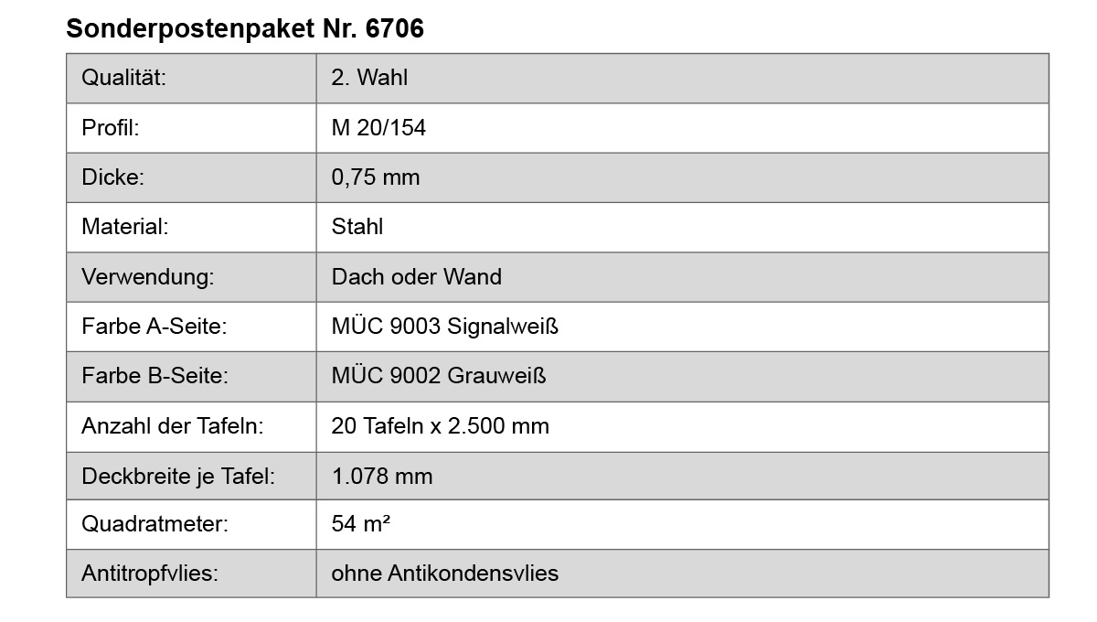 Es handelt es sich um Ware aus Überproduktion/Restabschnitten. Die Tafeln können Mängel, wie z.B. Beulen, Farbabweichungen, Kratzer, teilweise unbeschichtetes Material oder teilweise Vliesbeschichtung von unten, aufweisen. Diese Mängel stellen keinen Reklamationsgrund dar. Sofern unter „technischen Daten“ keine konkrete Materialstärke angegeben ist, kann die Materialstärke variieren. Der Profiltyp innerhalb eines Pakets ist gleich, die Geometrie kann variieren.